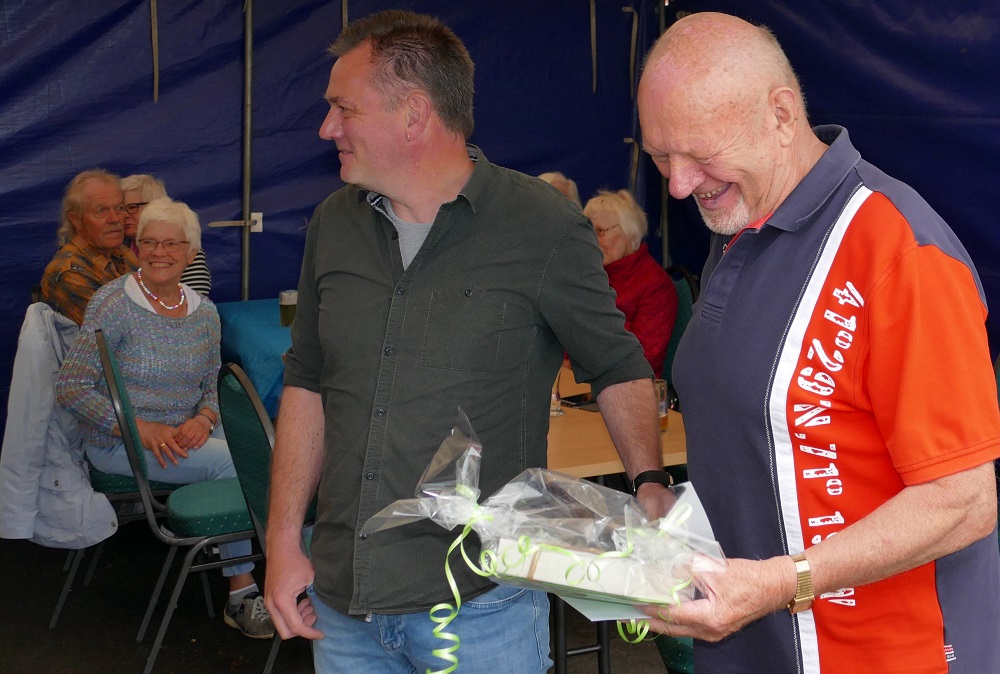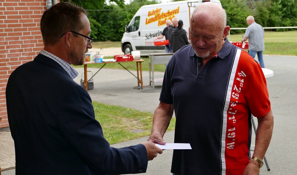 Der 2. Vorsitzende des TSV Lunestedt Andre Holscher und der Lunestedter Ortsvorsteher Thorsten Steinberg übergaben jeweils ein Jubiläumsgeschenk an Manfred Röper.